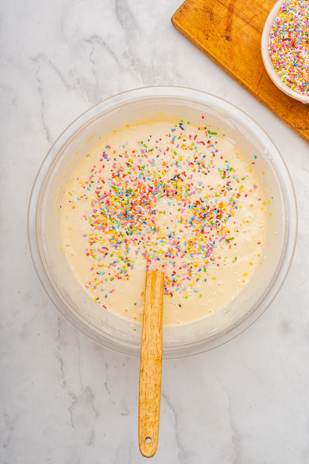 - Pour the wet mixture into the dry ingredients and gently stir until just combined. Be careful not to overmix—some lumps are okay. Gently fold in the sprinkles, stirring just enough to distribute them evenly.